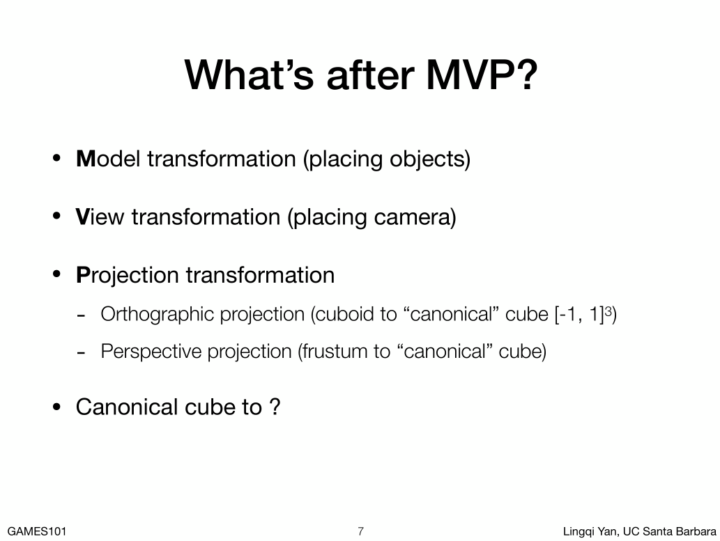 3D -> 2D 从三维到二维的变换我们叫做投影,这个投影也是一种非常重要的变换,之后会学到。