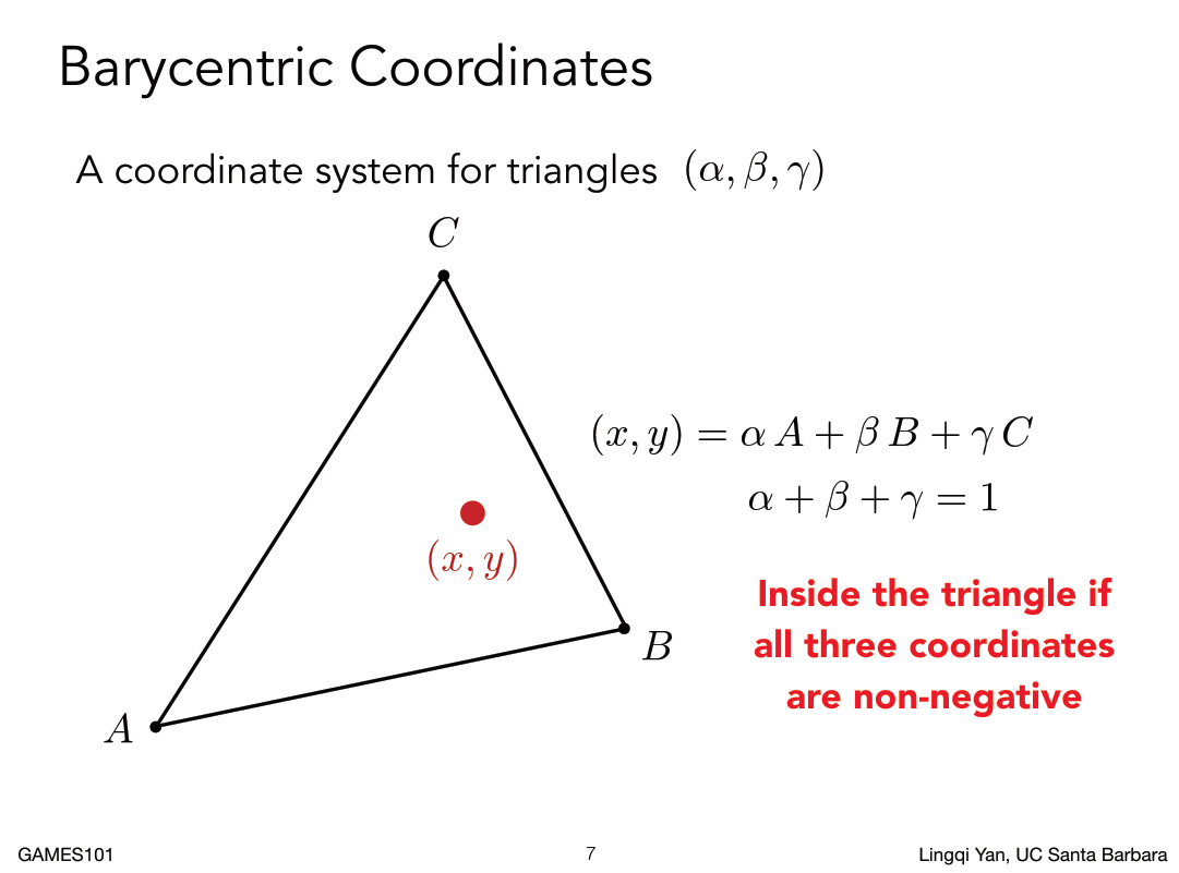 - 在三角形ABC所形成的平面内,任何一个点(x,y)都可以表示成三个顶点abc的线性组合(x,y) = αA+βB+γC (ABC指的都是坐标),线性组合的系数要满足a+b+r =1