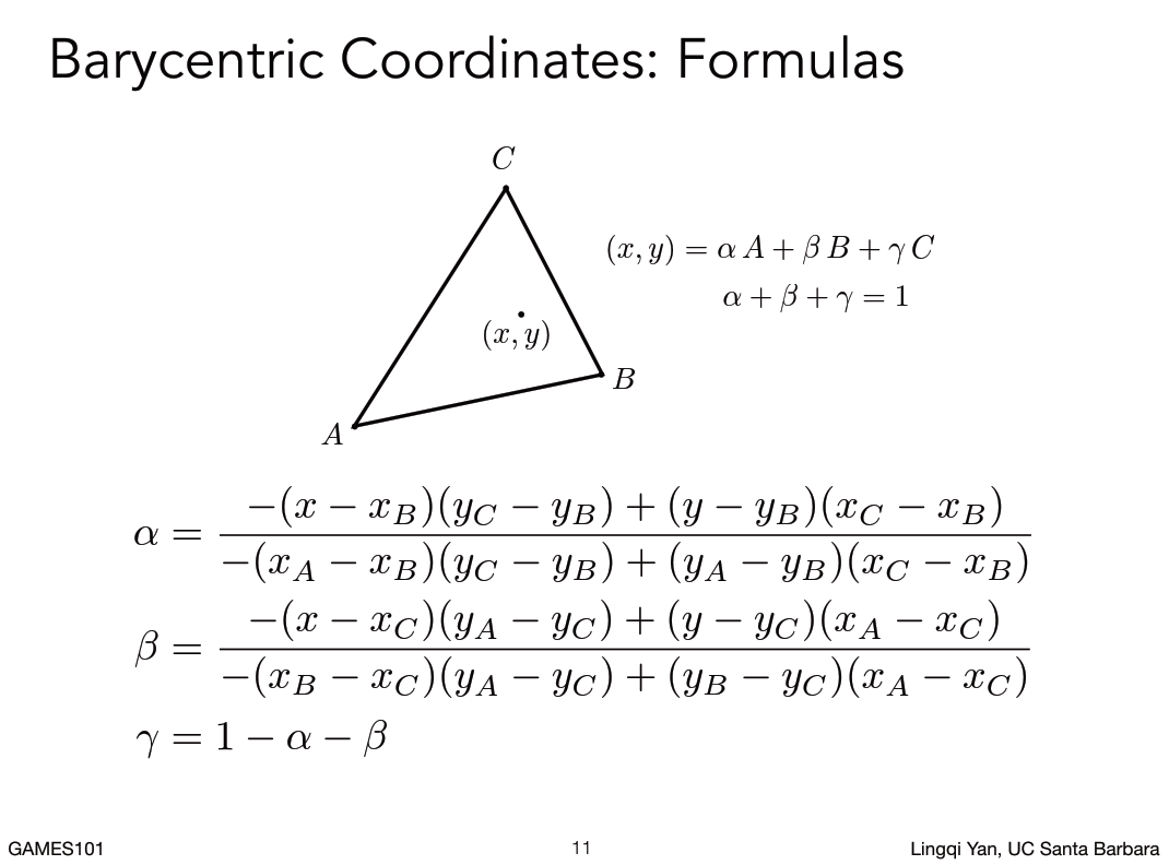 已知三角形内部任意点都可以用αA+βB+γC来表示,那么如果要插值某个属性,那么其也可以用线性坐标给组合起来。